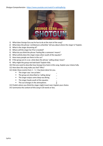 Shotgun By George Ezra Ks2 Reading Comprehension Teaching Resources
