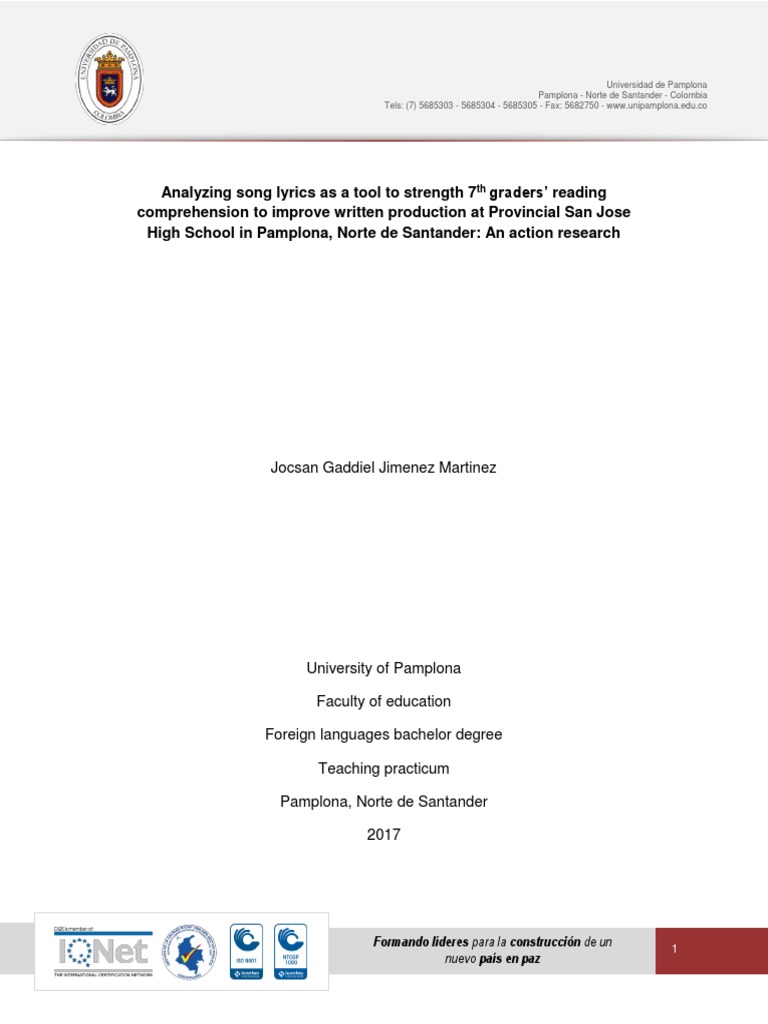 Analyzing Song Lyrics As A Tool To Strength 7 Graders Reading Comprehension To Improve Written Production At Provincial San Jose High School In Pamplona Norte De Santander An Action Research Pedagogy